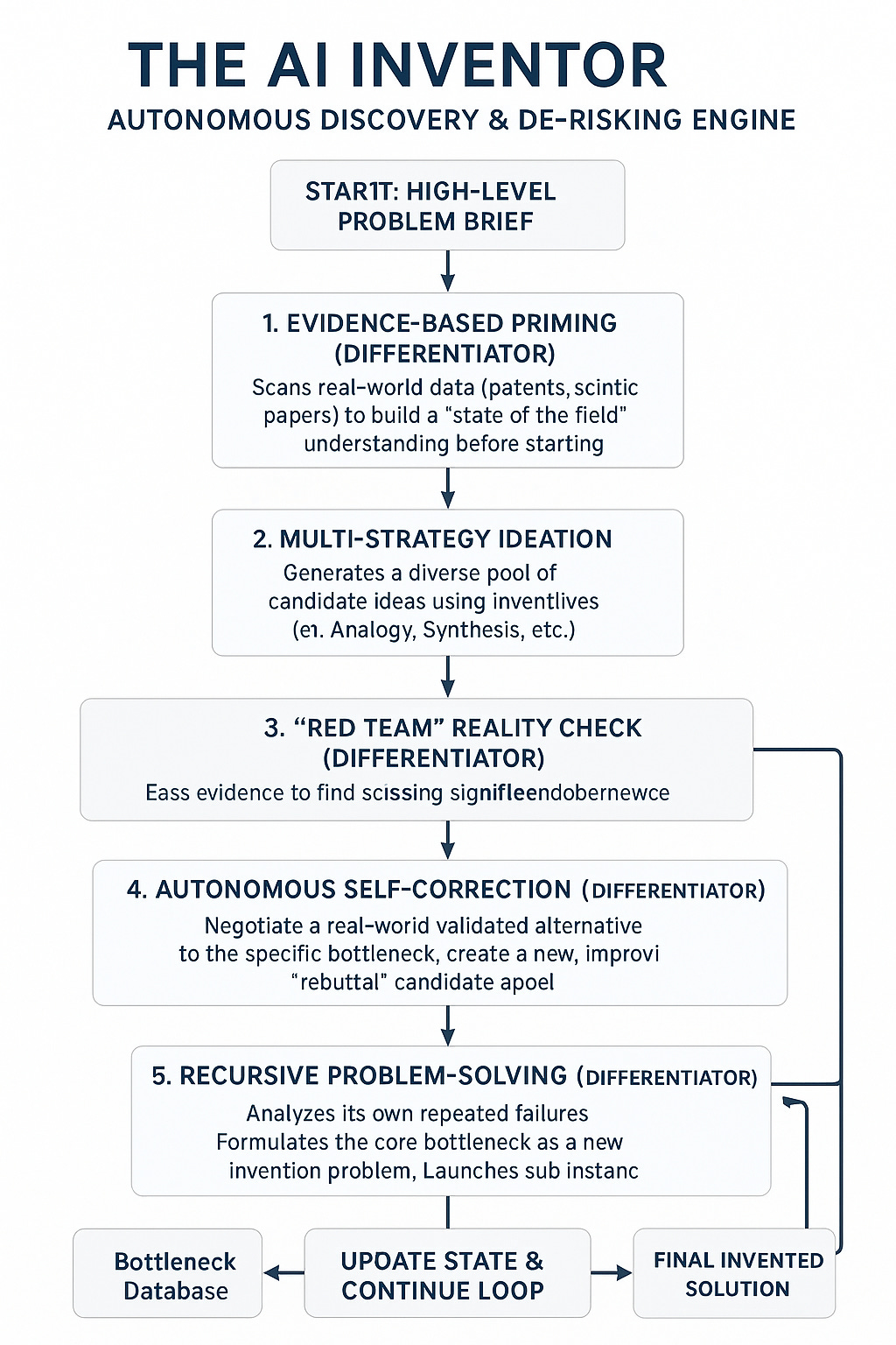 The AI Inventor is an autonomous agent designed to strategically navigate this landscape. It conceptualizes invention as a journey, planting a flag at the coordinates of a Problem and charting a de-risked, evidence-grounded path toward an Ideal Solution.